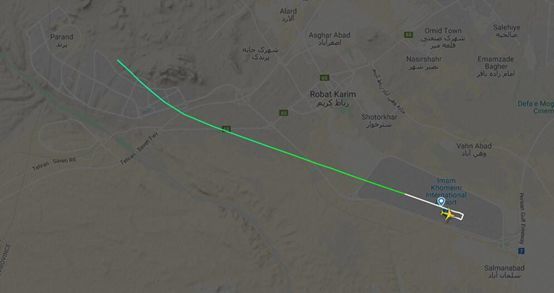先看圖的第一部分放大,我們可以看到如下情況,這架飛機(jī)先從德黑蘭霍梅尼機(jī)場跑道下方滑行道向右側(cè)跑道端頭滑行,經(jīng)過短暫運(yùn)行后,運(yùn)動(dòng)到跑道的最東部端頭,然后向西滑跑飛行,正常起飛離地,直線向前飛行,經(jīng)過1分30秒飛行后,飛機(jī)逐步向東轉(zhuǎn)向,并保持直線飛行,但是30秒時(shí)間,飛行軌跡消失,飛機(jī)墜毀,機(jī)上人員全部喪生。